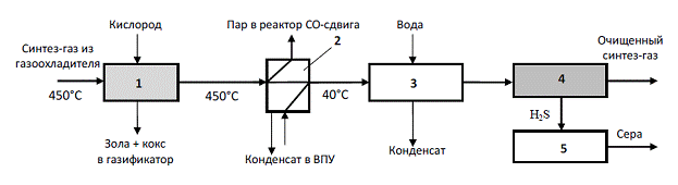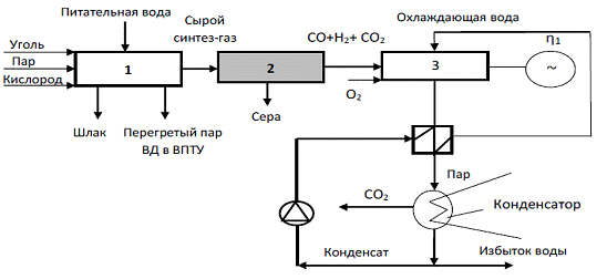 Одним из первых проектов ПГУ с депонированием углекислого газа является угольная ПГУ IGCC с системой CCS до сжигания – ТЭС FutureGen (США, штат Иллинойс). Согласно схеме, представленной на рис. ниже, кислород с чистотой 95% подается в поточный двухстадийный газификатор типа E-Gas. В газификатор подают ВУС, состоящую по массе на 40% из воды и 60% из угля. В качестве топлива планируется использовать уголь Illinois #6 со следующими характеристиками: C= 67,2%, N= 1,0%, S= 3,6%, Cl= 0,19%, O2 = 12,3%, Ac = 10,7%. Предполагаемая компоновка системы газоочистки ТЭС FutureGen: 1 – золоуловитель; 2 – конденсационная установка; 3 – гидролизная установка; 4 – удаление кислоты; 5 – установка Клауса На ТЭС FutureGenполученный углекислый газ будет сжиматься пятиступенчатым компрессором до давления 20,4 МПа, охлаждаться до температуры 150°С с переводом в жидкое состояние, после чего депонироваться. Водород в смеси с кислородом будет направляться в камеру сгорания газовой турбины. Для регулирования температуры горения смесь необходимо дополнительно разбавлять азотом из воздухоразделительного устройства. После ГТУ устанавливается котел-утилизатор, выполняющий функции охладителя/конденсатора продуктов сгорания и генерирующий пар высокого давления для паровой турбины (31 МПа, 648°С). 5. Проекты ПГУ IGCC/CCS cо связыванием СО2 после сжигания в турбине Данная установка внедряется компанией CES на демонстрационной ТЭС Kimberlina (Калифорния, США) в рамках проекта Zero emission power plants (ZEPP). Развитие установки намечено в три этапа. На первом предполагается использовать в качестве топлива природный газ, на втором – синтез-газ внутрицикловой газификации угля / биомассы с системой CCS после сгорания (Oxyfuel), на третьем – создание ПГУ IGCC / CCS на базе высокотемпературной паротурбинной установки (ВПТУ). Согласно схеме второго этапа, очищенный синтез-газ, состоящий из Н2, СО и СО2, направляется в камеру сгорания газовой турбины для сжигания в кислороде. В результате на выходе из газовой турбины получают смесь водяного пара и углекислого газа, разделение которой происходит в конденсаторе/сепараторе. Полученная в конденсаторе вода после нагрева используется для снижения температуры в камере сгорания газовой турбины до 538–593°С. Особенностью камеры сгорания является подача в нее не чистого водорода, а смеси газов – CO, CO2, H2, H2O. Это может быть синтез-газ из угля/биомассы или природный газ. Аналогичные проекты будут реализованы компанией CESв Голландии (проект SEQ-1), Норвегии (проект ZENG) и США. К 2015 году компания CESпланирует модернизировать данную технологию (третий этап) путем объединения газовой и паровой турбины в одном агрегате – высокотемпературной паротурбинной установке ВПТУ. Модернизированная схема связывания СО2 после сжигания показана на рис.: ![]() Модернизированная схема ПГУ-Т IGCC/CCSсо связыванием СО2 после сжигания и с ВПТУ: 1 – газификатор с газоохладителем; 2 – система газоочистки; 3 – ВПТУ
